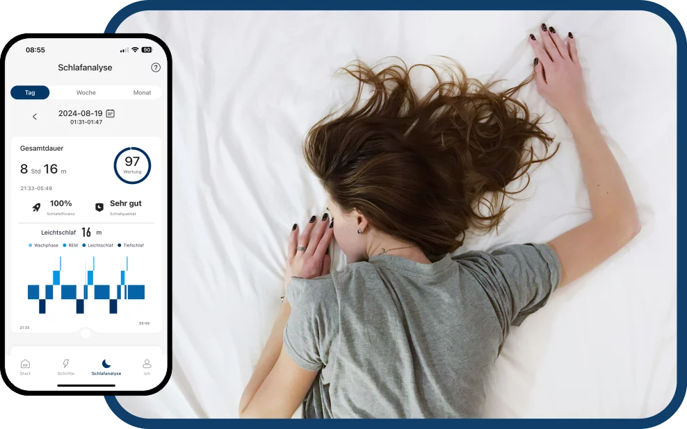 Deine Blaupunkt Smart Ring App gibt Auskunft über den Schlafqualitätswert, der auf der Berechnung des PSQI (Pittsburgh Sleep Quality Index) beruht. Dabei werden die Grundprinzipien wie Regelmäßigkeit des Schlafs, die Schlafdauer, das Tiefschlafverhältnis, die nächtliche Wachzeit, die Einschlafdauer und andere Faktoren gemessen, um die Schlafqualität zu beurteilen.